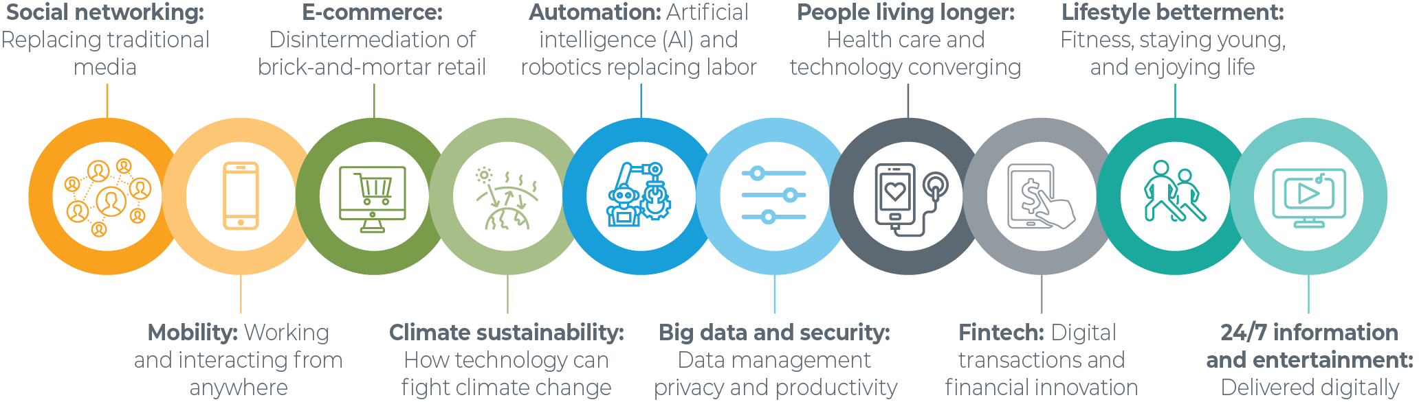 We seek to identify inflection points in multiyear secular trends driven by changes in technology, consumer preferences, demographics, and environmental sustainability, which can lead to significant increases in their markets, earnings trajectories, and market capitalizations.